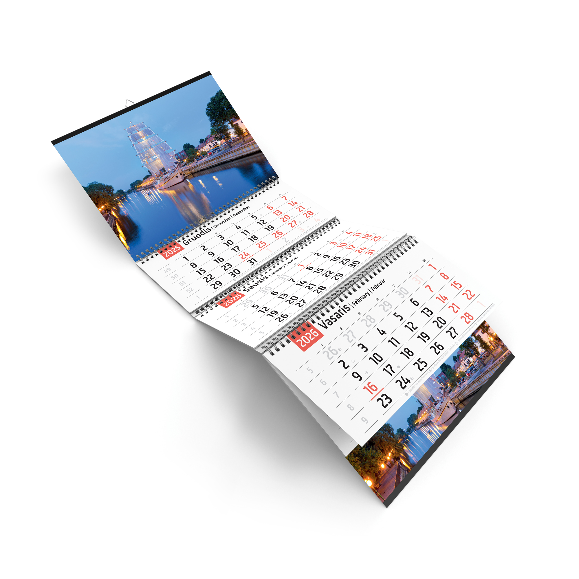 Sulankstomas sieninis kalendorius 2026 metams – 3 dalių su Klaipėdos laivo Meridiano vaizdu vakare, prišvartuotu miesto centre, kairiajame Danės krante. Praktiškas ir estetiškas pasirinkimas namams, darbo erdvei ar dovanai. Aiškiai matomi mėnesiai ir patogus datos langelis leidžia lengvai sekti laiką visus metus.