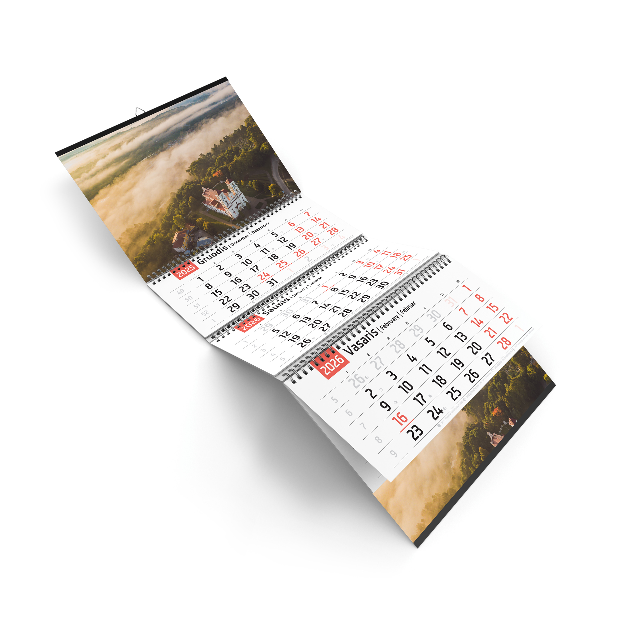 Sulankstomas sieninis kalendorius 2026 metams – 3 dalių su Raudondvario bažnyčios vaizdu iš drono, užfiksuotu ankstyvą rytą. Praktiškas ir estetiškas pasirinkimas namams, darbo erdvei ar dovanai. Aiškiai matomi mėnesiai ir patogus datos langelis leidžia lengvai sekti laiką visus metus.